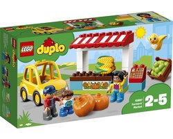 • Inclusief drie LEGO DUPLO figuren: een marktkraameigenaar, een vader en een kind, plus een vogelfiguur.• De set bestaat uit een marktkraam en een auto om zelf te bouwen.• Accessoires: een kassa, pompoenen, appels en een maïskolf.• Het is leuk om met de auto naar de boerenmarkt te rijden en...